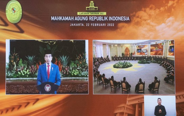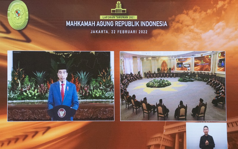 Jakarta-Humas: Presiden Republik Indonesia Joko Widodo menghadiri acara Laporan Tahunan Mahkamah Agung tahun 2021 secara virtual pada Selasa, 22 Februari 2022.