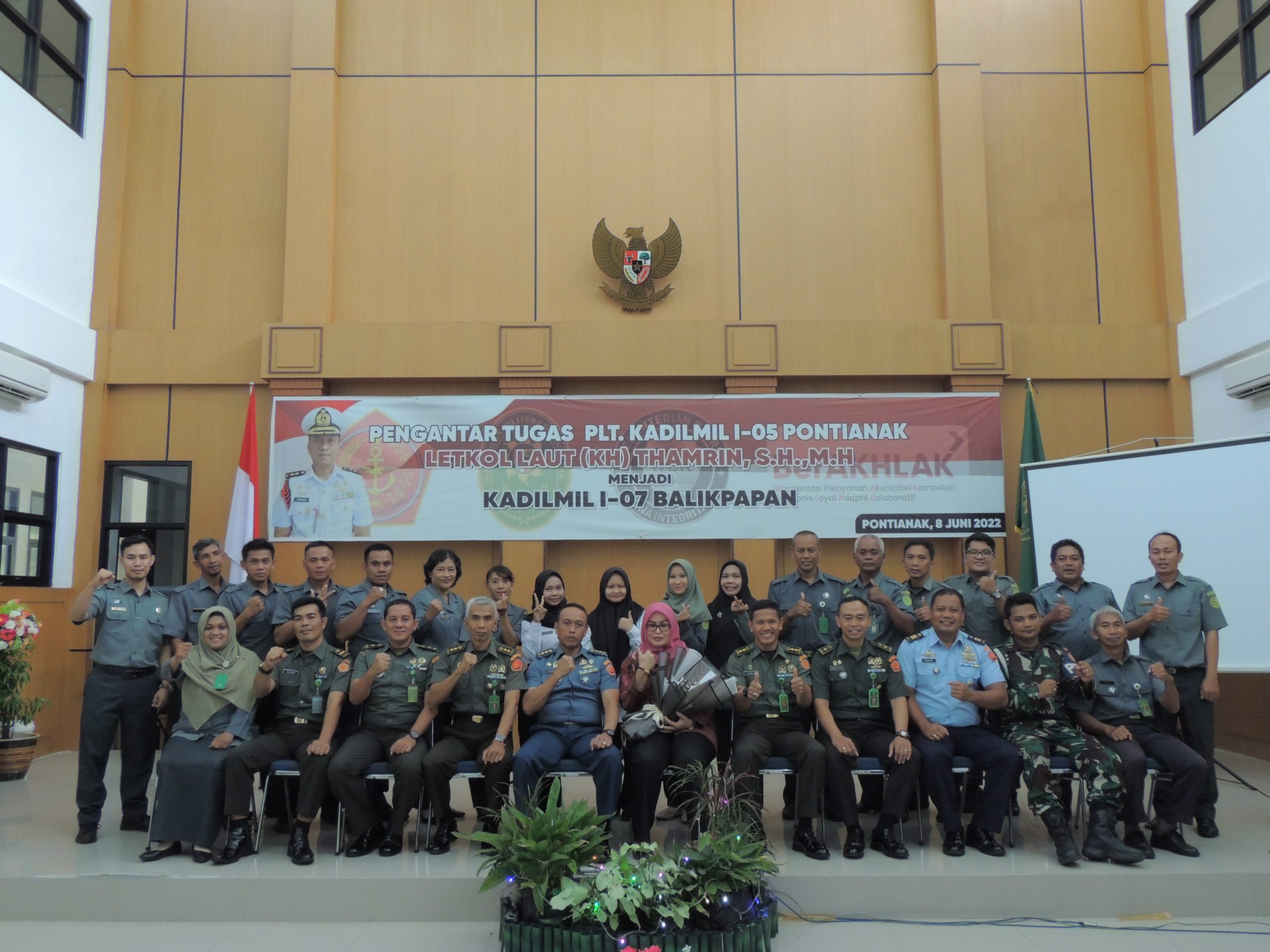 Pontianak, Rabu 8 Juni 2022. Bertempat di Ruang Sidang Cakra Pengadilan Militer I-05 Pontianak telah dilaksanakan Acara Pengantar Alih Tugas Plt. Kadilmil I-05 Pontianak Letkol Laut (KH) Thamrin, S.H., M.H. yang akan pindah tugas menjadi Kepala Pengadilan Militer I-07 Balikpapan berdasarkan Keputusan Ketua Mahkamah Agung RI Nomor 159/KMA/SK/V/2022 tentang Pemberhentian dari dan Pengangkatan dalam Jabatan di Pengadilan dalam Lingkungan Pengadilan Militer dan Surat Tugas Dirjen Badilmiltun Mahkamah Agung RI Nomor 103/Djmt/Ratgas/KP.04.1/V/2022 tanggal 25 Mei 2022 tentang Pelaksanaan Pemberhentian dari dan Pengangkatan dalam Jabatan di Pengadilan dalam Lingkungan Peradilan Militer. Pada kesempatan penyampaian kesan dan pesan selama bertugas di Pengadilan Militer I-05 Pontianak Letkol Laut (KH) Thamrin, S.H., M.H. di dampingi oleh Ibu Dewi Apriyanti, S.H., M.H. selaku ketua Dharmayukti Karini Dilmil I-05 Pontianak.
