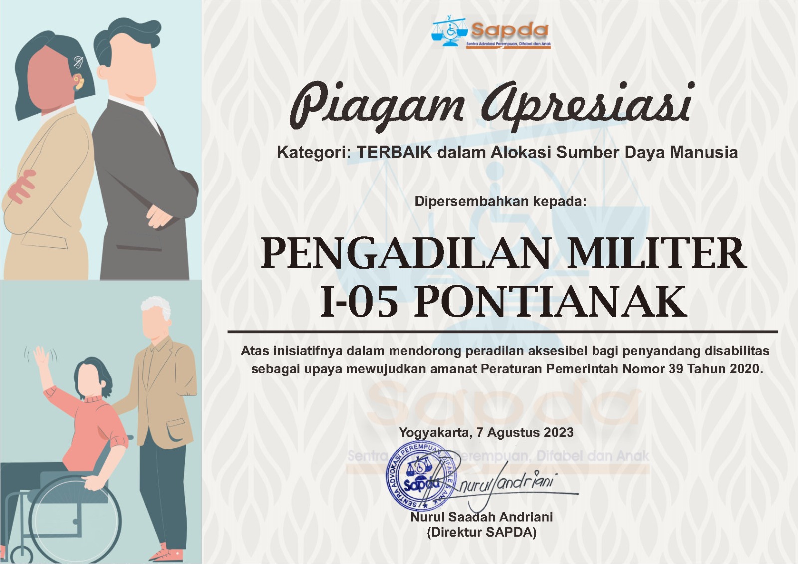 Pengadilan Militer I-05 Pontianak memperoleh sertifikat piagam apresiasi kategori “Terbaik dalam Alokasi Sumber Daya Manusia” yang diberikan oleh SAPDA (Sentra Advokasi Perempuan, Difabel dan Anak)